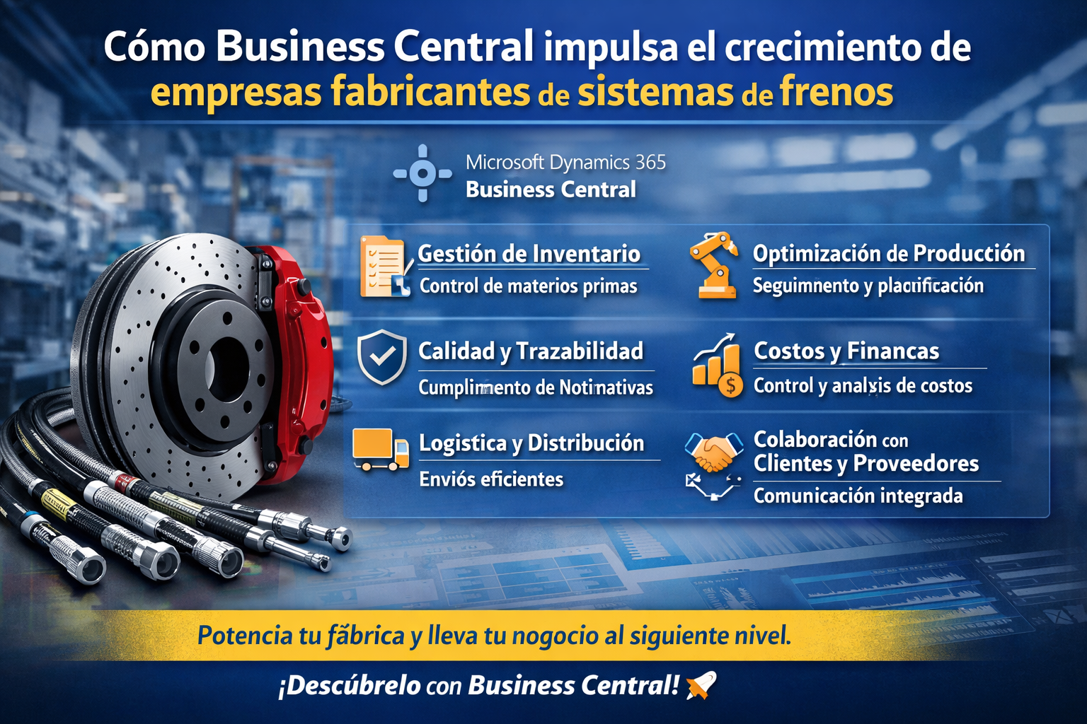 Microsoft Dynamics 365 Business Central es mucho más que un ERP; es una herramienta estratégica para empresas dedicadas a la fabricación y desarrollo de sistemas de frenos, cables de control y latiguillos. Con su capacidad para integrar operaciones, garantizar calidad y optimizar costos, ayuda a potenciar el crecimiento y mejorar la competitividad en el mercado global.